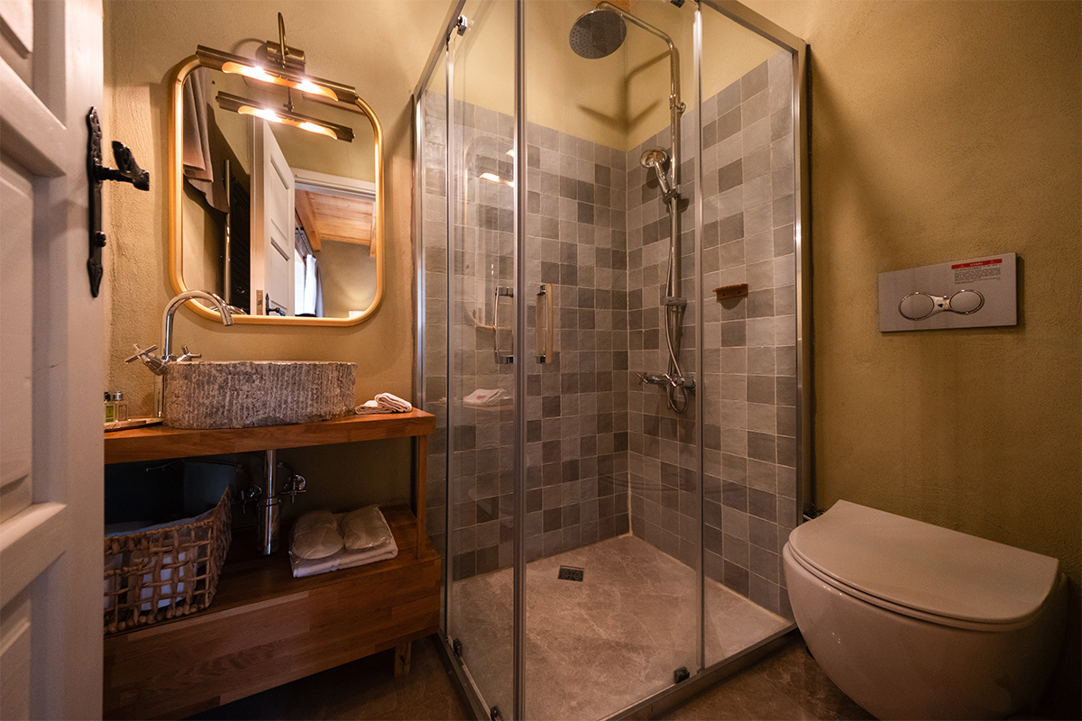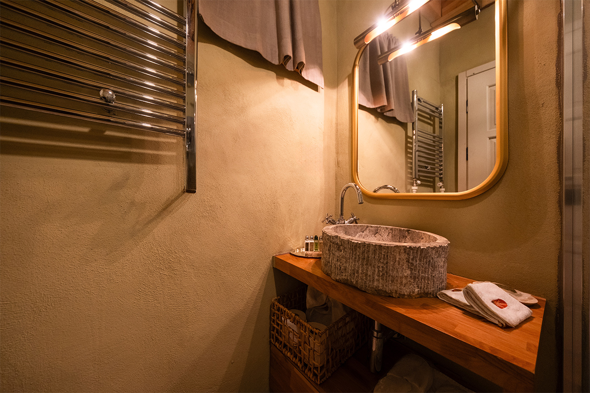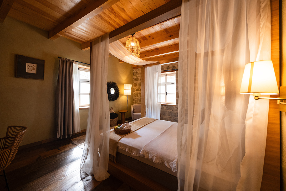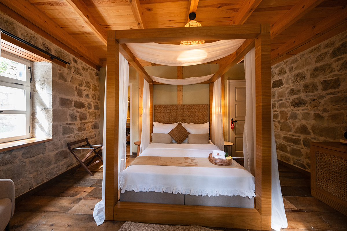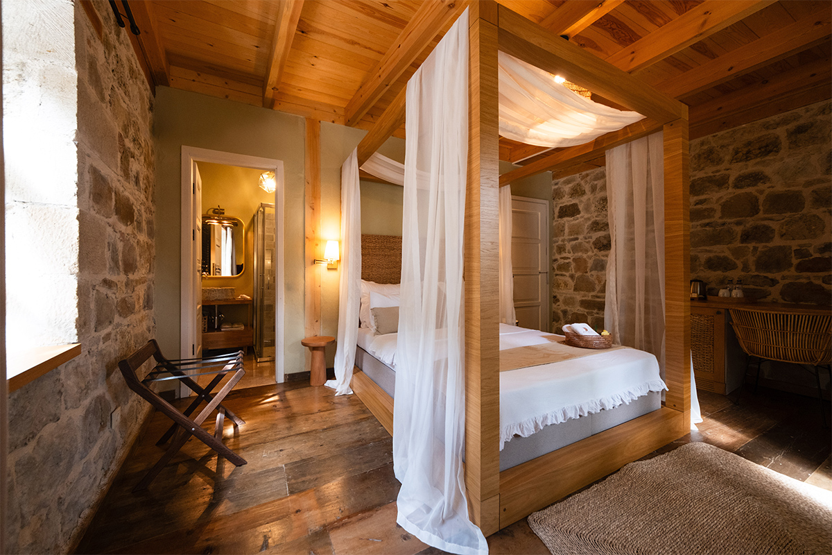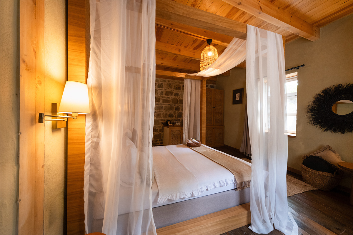 Taş duvarlar, nötr tonlarda sade bir iç tasarım ve doğal ışıkla bütünleşen pencere açıklıkları sayesinde huzurlu ve ferah bir atmosfer sunar.
