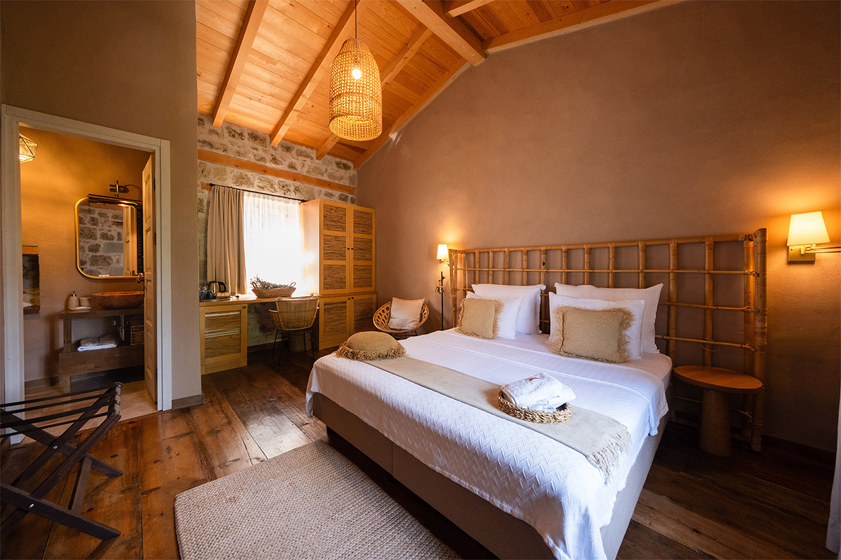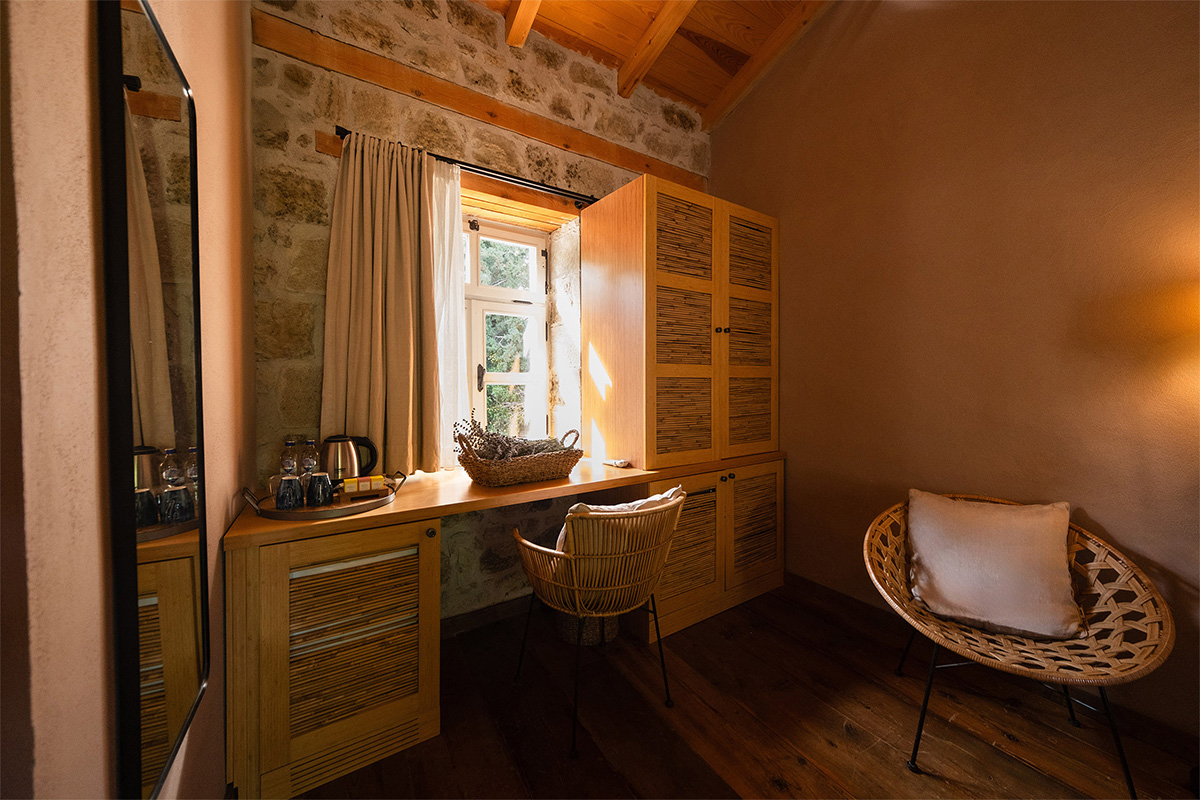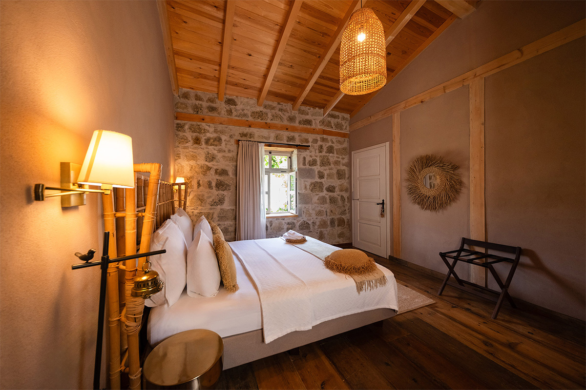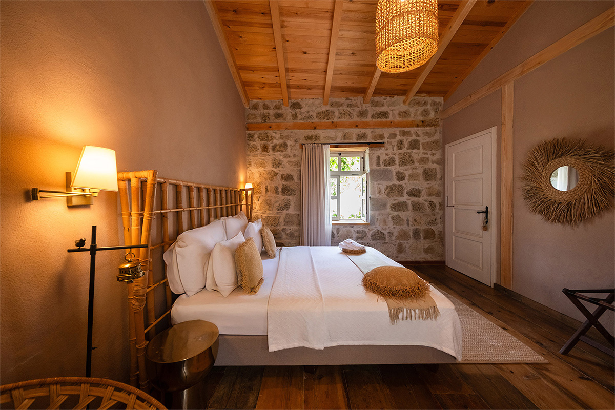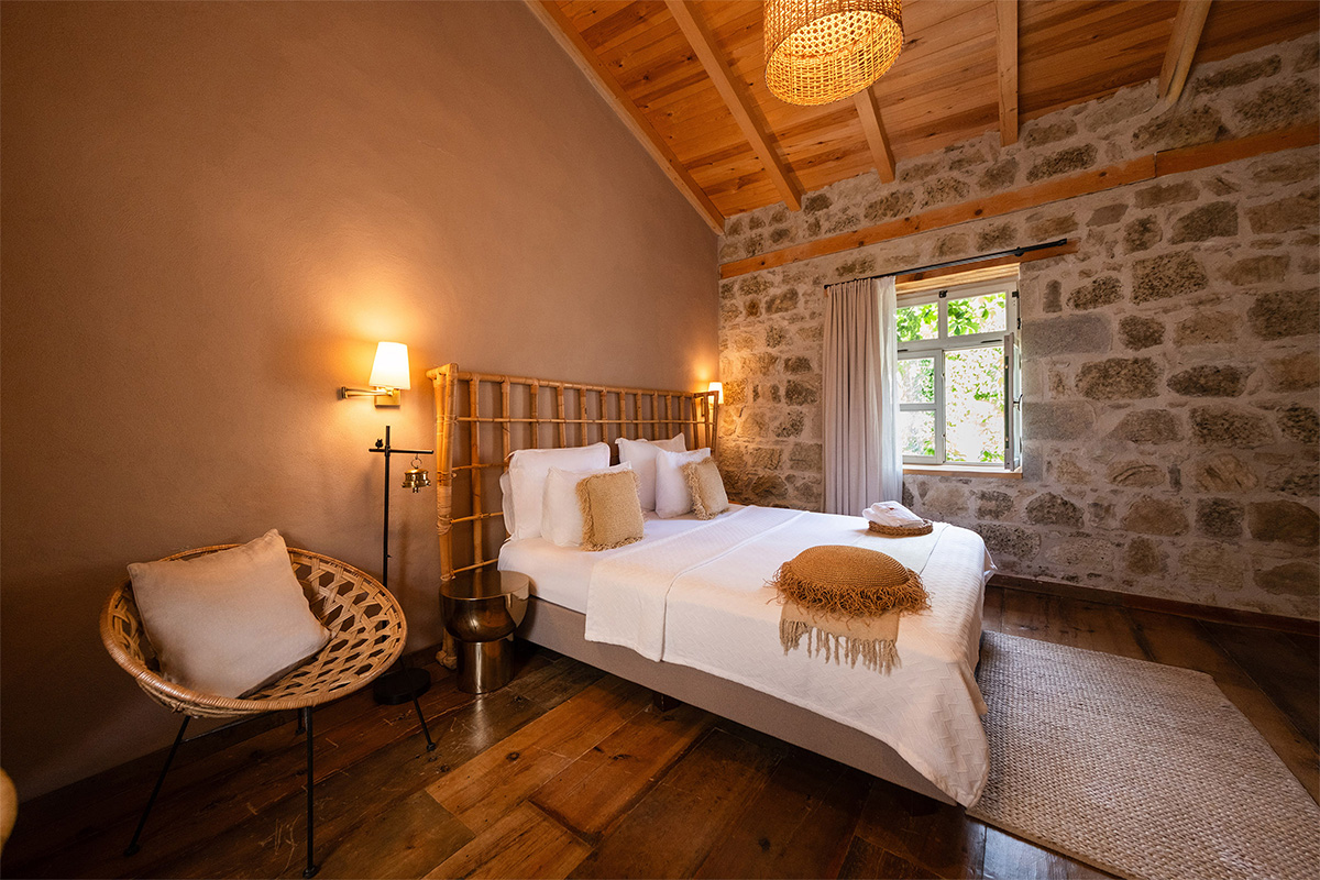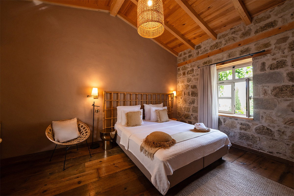 Doğal taş mimariyle uyumlu olarak tasarlanan oda, gün ışığı alan yapısı ve sade dekorasyonuyla sakin bir atmosfer yaratır.