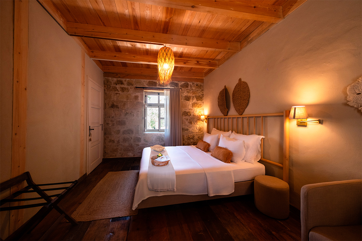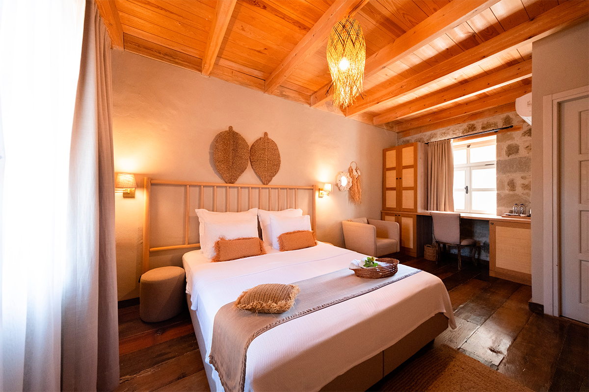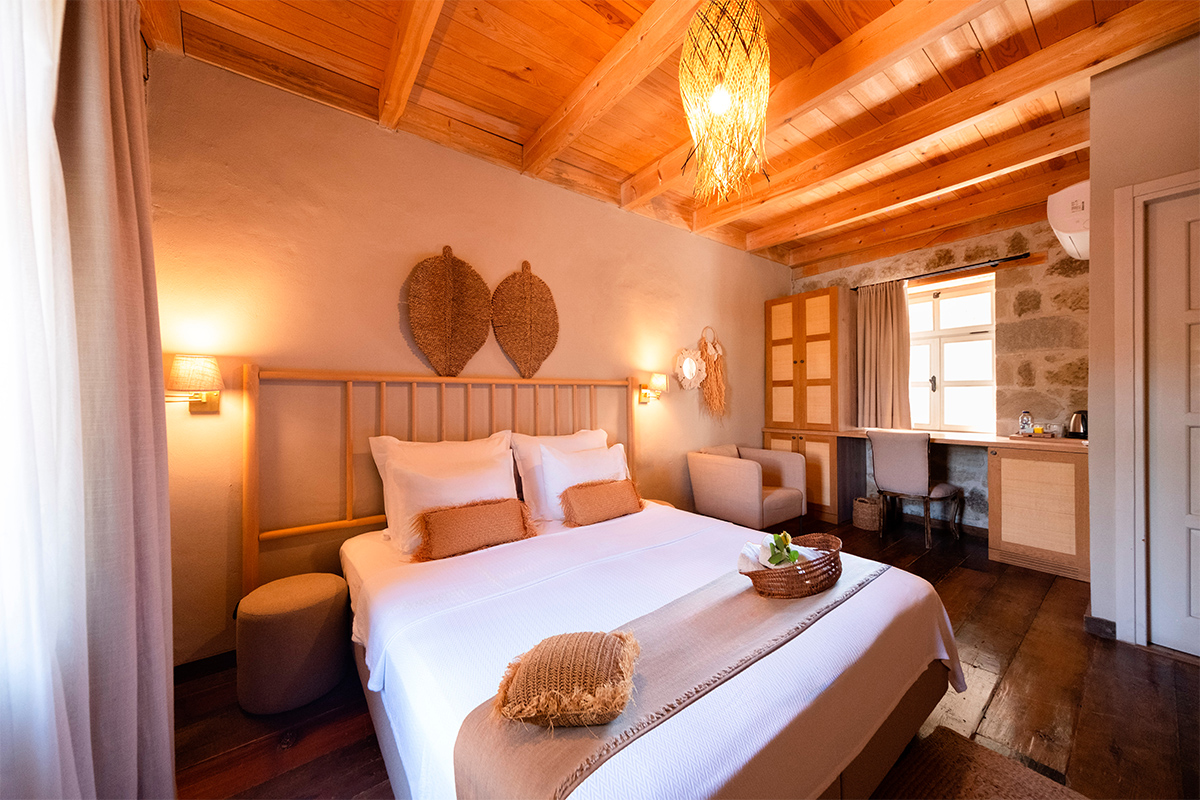 Doğal malzemelerle sade bir anlayışla tasarlanan odada, taş mimarinin dinginliği ve köy manzarasının sakinliği bir araya gelir.