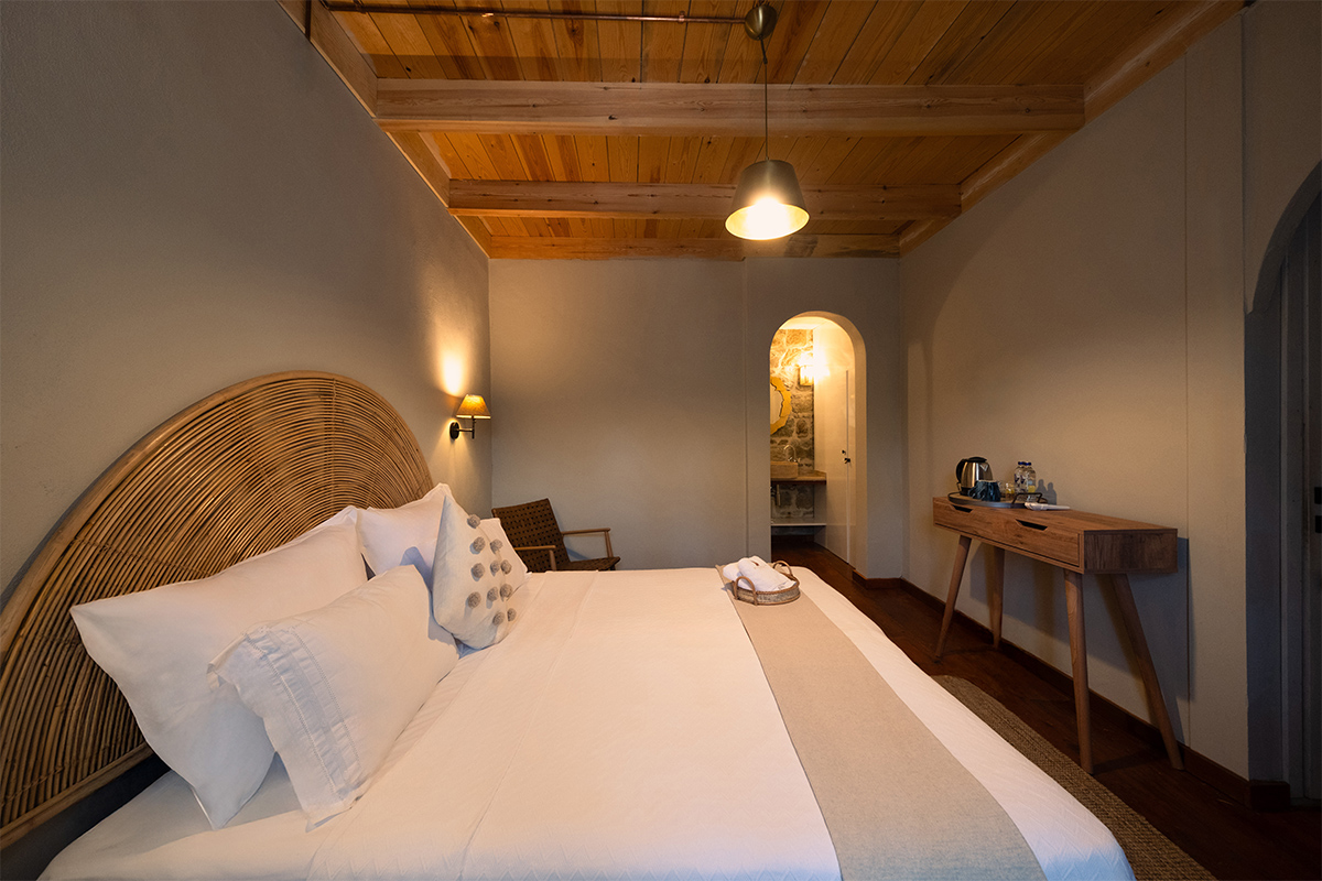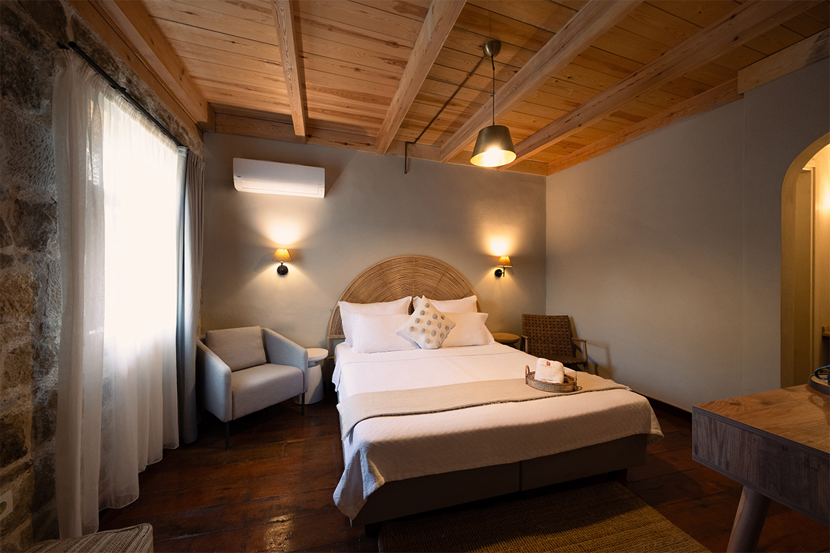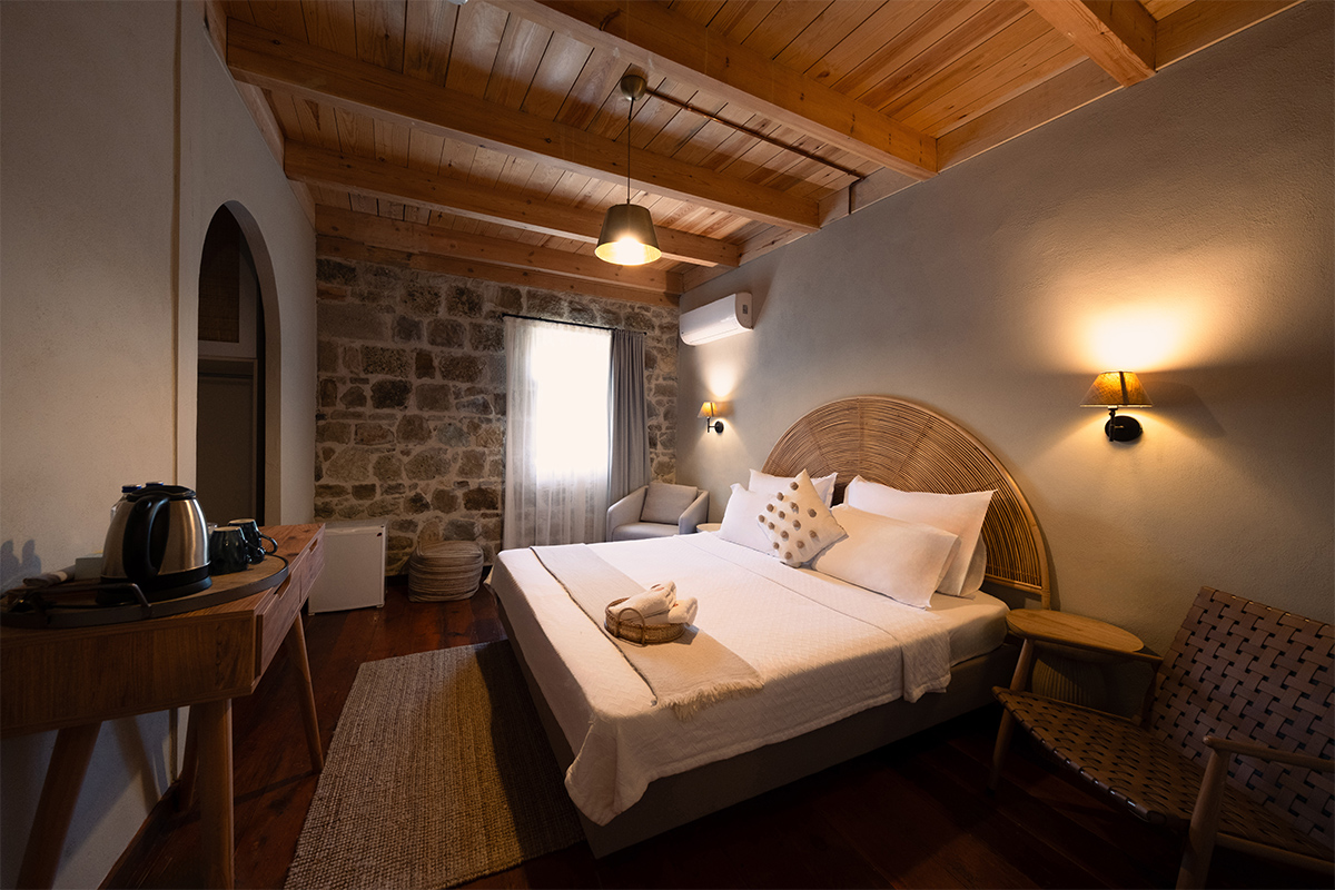Taş mimariyle uyumlu, sade ve işlevsel tasarımı; doğal ışıkla birleşerek sakin bir atmosfer oluşturur.
