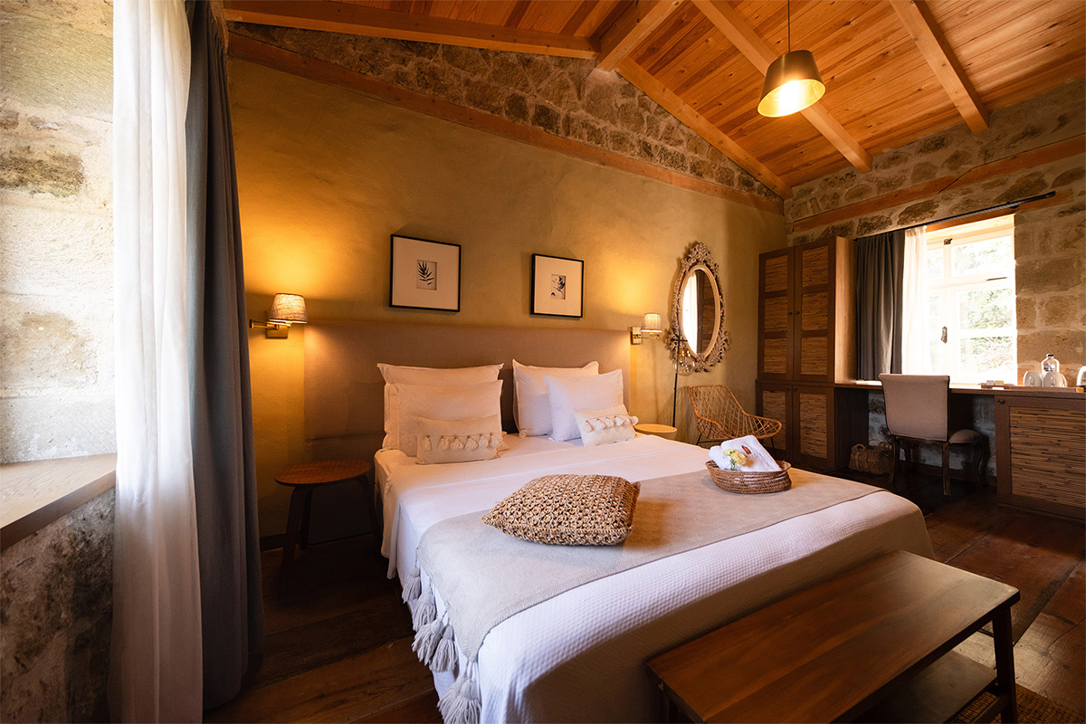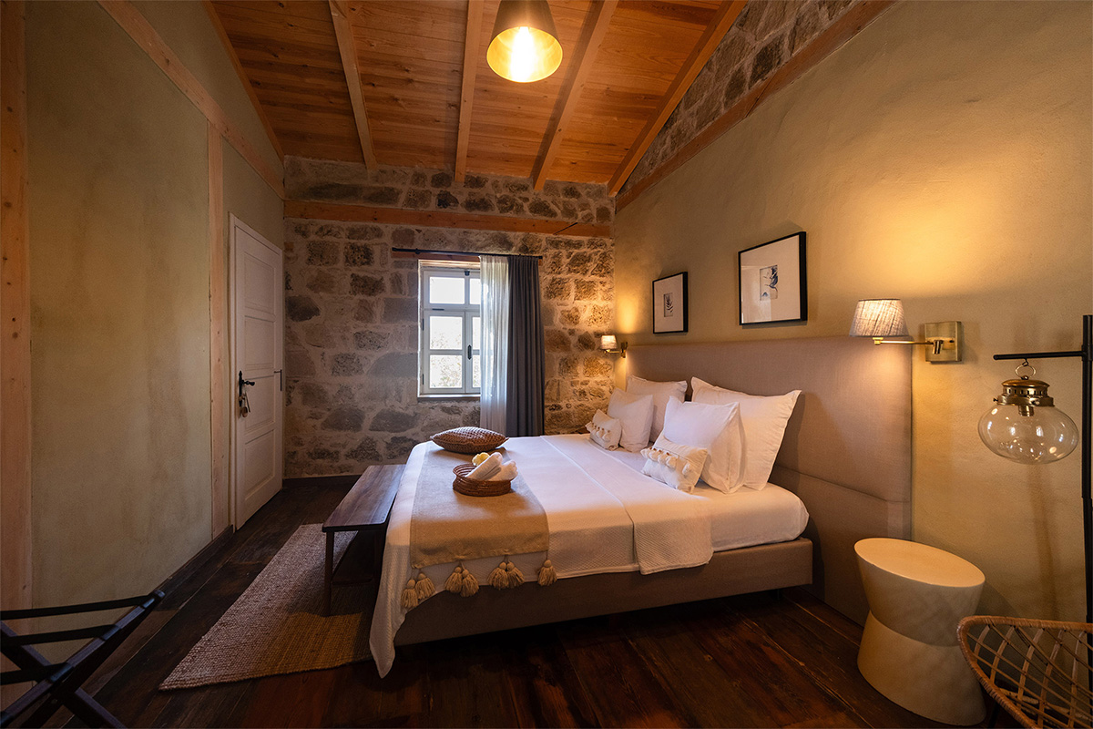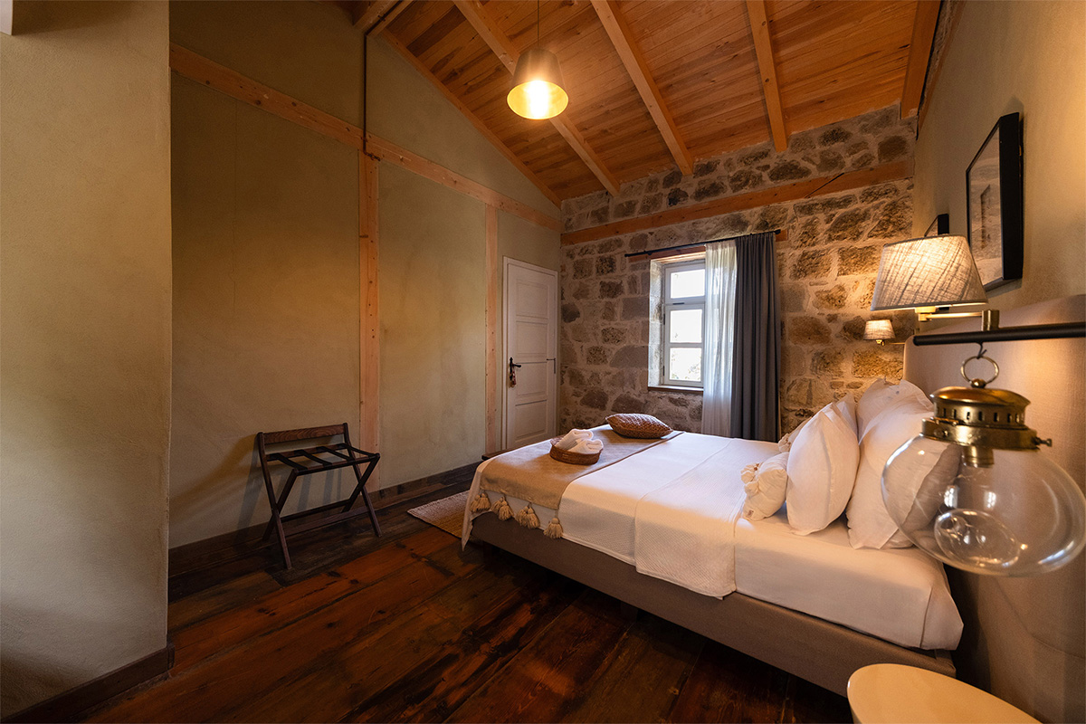 Taş mimarinin sadeliğiyle döşenen odada, doğal ışık ve manzara ön plandadır.