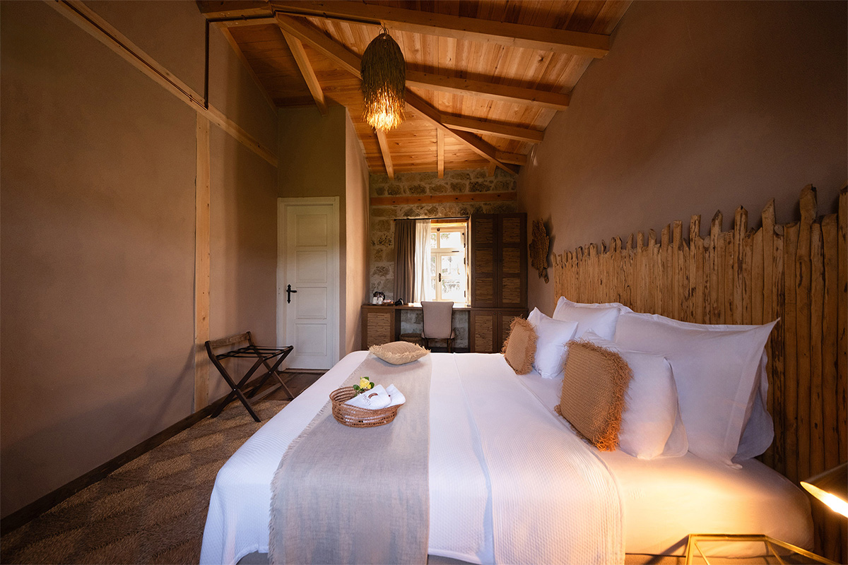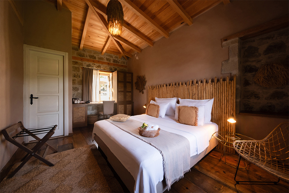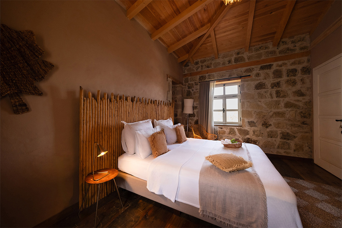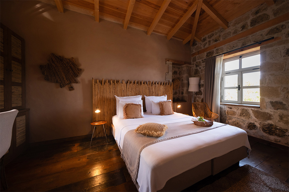 Köyün sessizliği ve denizin uzaktan gelen dinginliğiyle çevrili bu oda, hem görsel hem ruhsal açıdan dinlendirici bir deneyim vadeder.